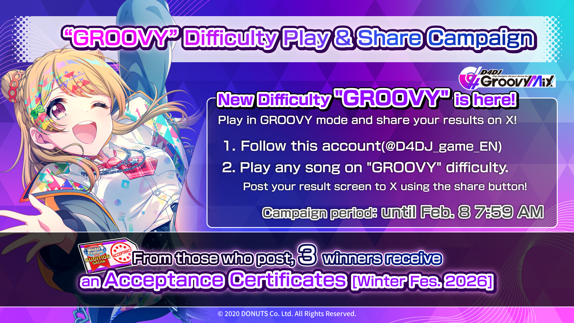 To celebrate the addition of the “GROOVY” difficulty, we will be holding a Song Play & Share Campaign on the official D4DJ Groovy Mix X account!